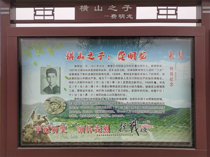 费明龙(1911-1940),安徽当涂县人,祖籍湖北孝感,其曾祖辈逃荒到当涂小丹阳镇东库村(现名山河村)垦荒定居,到费明龙这一代,家境殷实,已成为拥有300多亩土地、丹阳镇上29间市面房屋的富户。青年时期的费明龙在丹阳镇教过书、当过小职员。他目睹军阀混战,家乡兵荒马乱,平民百姓处于水深火热之中,深感旧中国的腐败和民族的危机,萌发了民主新思想。抗日战争全面爆发后,日军实行惨无人道的“三光”政策,激发了费明龙满腔的民族仇恨,国民党残兵败将和地方土匪鱼肉百姓,更加坚定了他向往革命、投身救亡的信念。1937年冬,他参加了当涂回乡进步青年员工邵时安发起的“当芜青年抗日救亡团”。
