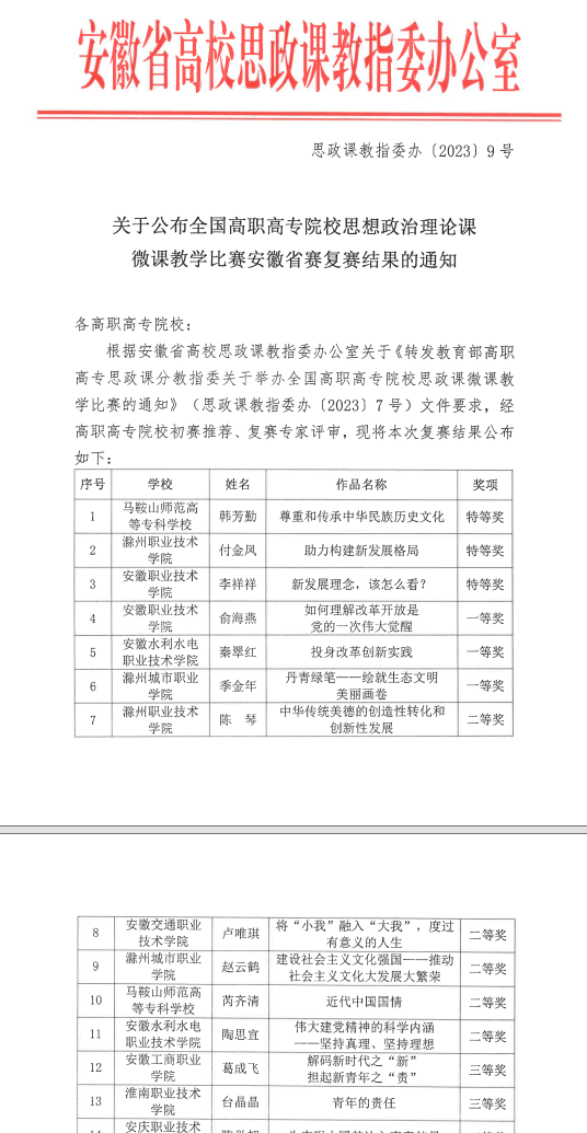 为贯彻落实习近平新时代中国特色社会主义思想,深入学习贯彻党的二十大精神,由教育部高职高专思想政治理论课分教学指导委员会、全国高职高专院校思想政治理论课建设联盟主办的全国高职高专院校思想政治理论课微课教学比赛安徽省复赛于2023年8月在芜湖职业技术公司304永利集团举行,经过紧张激烈的角逐,公司304永利集团党总支书记韩芳勤老师展示的微课“尊重和传承中华民族历史文化”荣获特等奖、芮齐清老师展示的微课“近代中国国情”荣获二等奖。