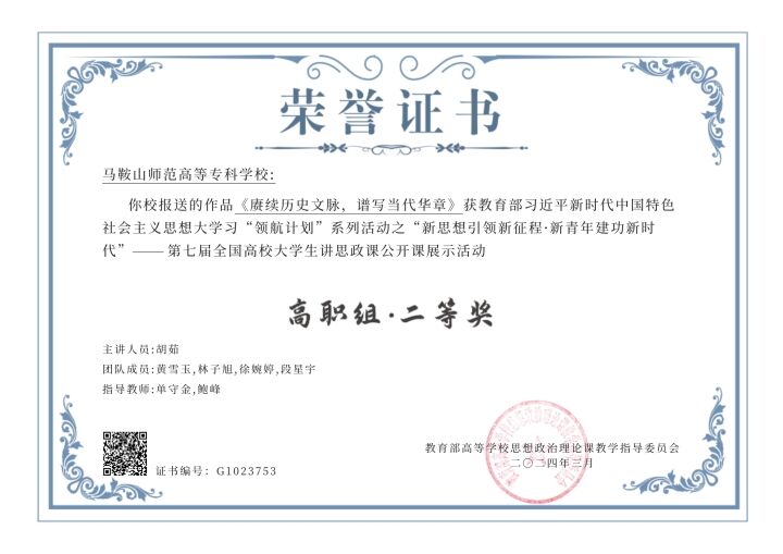 近日,教育部“领航计划”第七届全国高校老员工讲思政课公开课展示活动评审结果,304永利集团官网入口员工胡茹团队(成员:黄雪玉、徐婉婷、林子旭、段星宇,指导教师:单守金、鲍峰)的作品《赓续历史文脉,谱写当代华章》获高职组二等奖,是安徽省高职高专院校入围本届高职组取得的最佳成绩,实现公司在该赛项的较大突破。
